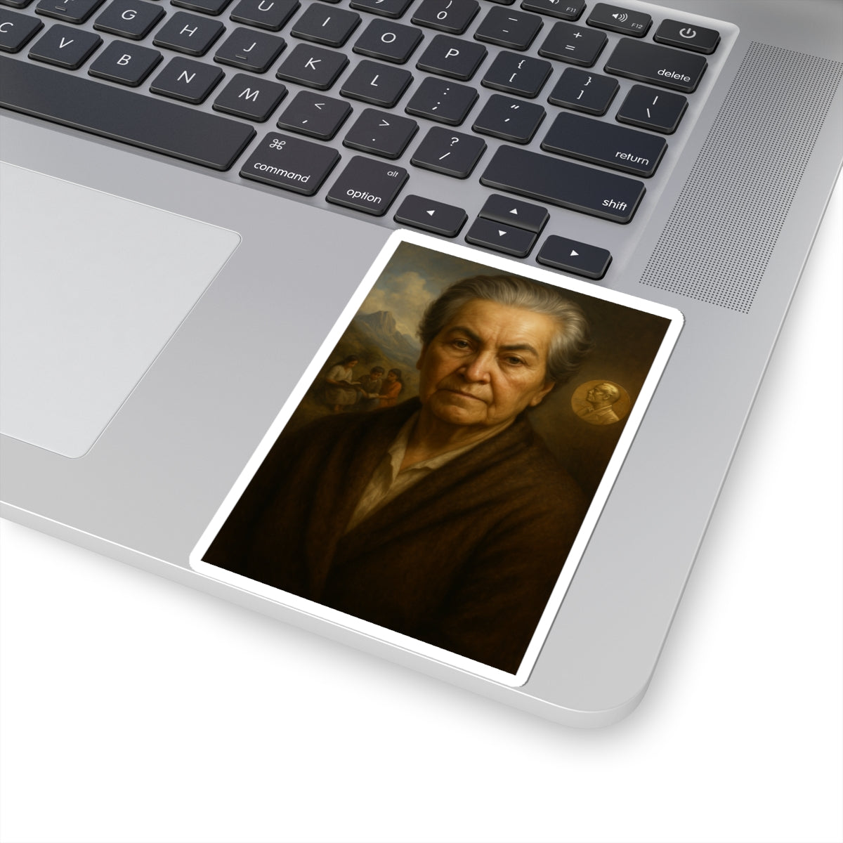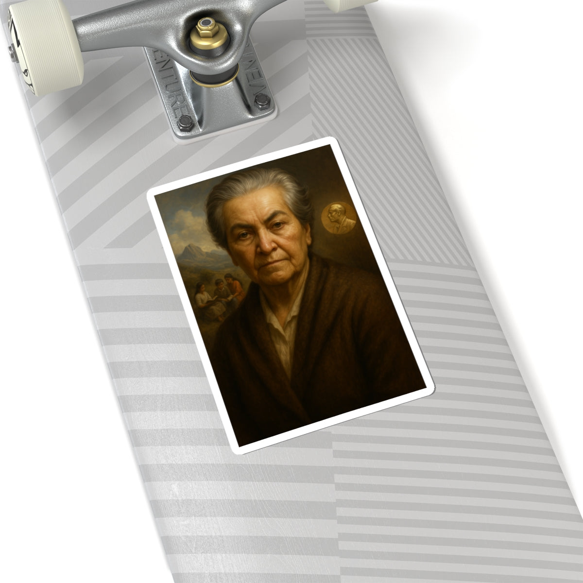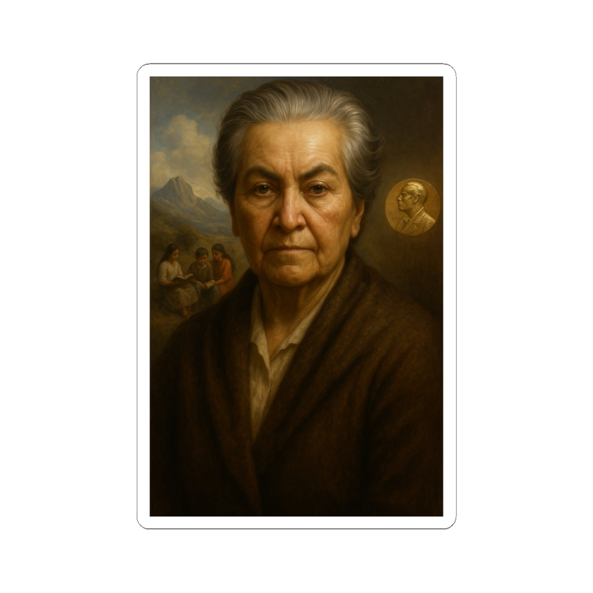 Conecta con la poesía, la educación y la serenidad con este sticker de Gabriela Mistral, primera mujer latinoamericana en ganar el Premio Nobel. Su diseño cálido y simbólico la hace perfecta para maestras, lectoras o amantes de la cultura andina. Ideal para personalizar espacios con profundidad y belleza.